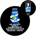 Официальная шайба чемпионата мира по хоккею 2013 года. Диаметр 7,5 см, высота 2,5 см. В правом верхнем углу - обратная сторона шайбы. Производство: Gufex, Чехия.